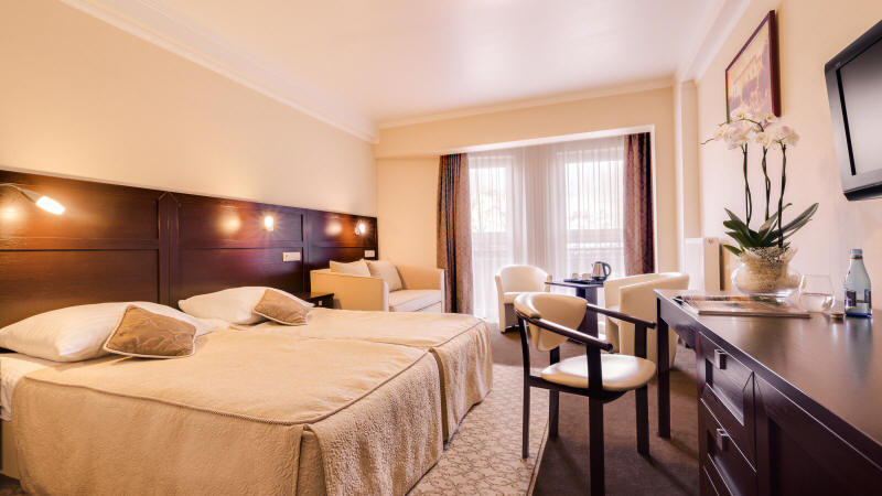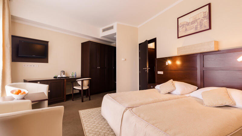 ir 6 apartamentai. Liukso ir standartiniai kambariai yra tinkamai įrengti: vonios kambarys su vonia arba dušu, telefonas, LCD 32"/42" su palydovine televizija, mini baras, seifas, nemokama WiFi