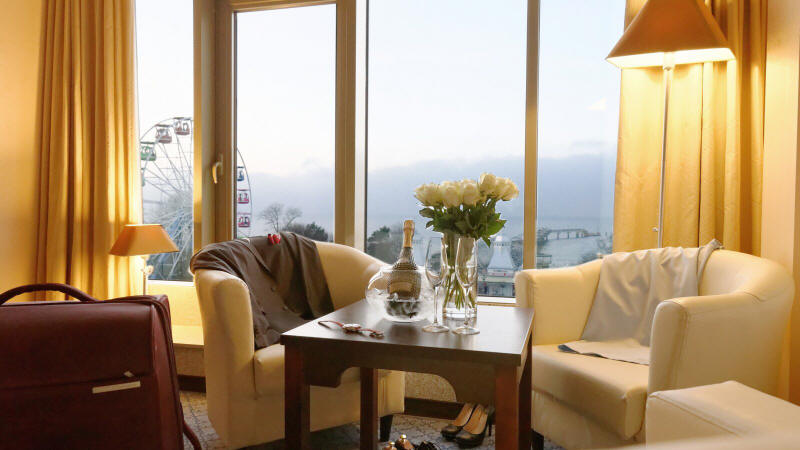 atsiveria vaizdas į Baltijos jūrą, gretimą Usedom salą, taip pat Žvaigždžių promenadą ir istorinę prieplauką.